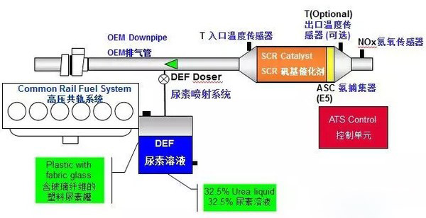當共軌系統(tǒng)噴射到燃燒室燃燒后產(chǎn)生的廢氣進入排氣系統(tǒng),SCR利用尿素噴射系統(tǒng)將尿素水溶液噴入排氣系統(tǒng),在廢氣流中分解為氨氣并在催化劑的作用下與氮氧化物發(fā)生反應,使之轉(zhuǎn)化為無害的氮氣和水。系統(tǒng)還在尾氣排放前用氮氧化物傳感器檢測尾氣是否達到排放標準。由于SCR技術需要更高的發(fā)動機燃燒溫度,需在催化器前使用溫度傳感器。