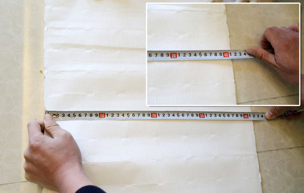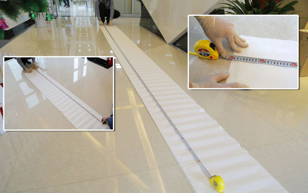 濾紙面積的大小也直接關(guān)系著濾芯的過濾能力,接下來我們開始測量這款主芯的濾紙面積,鑒于濾紙的長度過長,我們的測試空間和測量工具受限,所以先將濾紙進行對折,測試一半的長度。我們測試所需的尺子最長只有5米,即使對折之后也要分兩次進行測量。