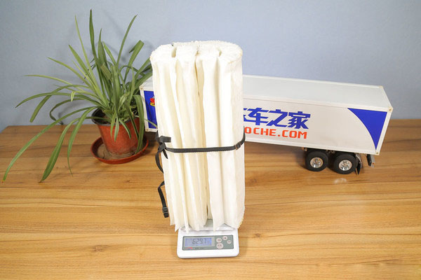 從拆解下來的端蓋上可以清晰的看到,固化的粘結(jié)劑經(jīng)過敲擊之后,已經(jīng)出現(xiàn)了大塊脫落。拆下來未經(jīng)粘合的濾紙已經(jīng)散開,我們利用細帶將濾紙捆綁在一起進行稱重,去掉細帶的重量,主芯濾紙的凈重為0.62千克。