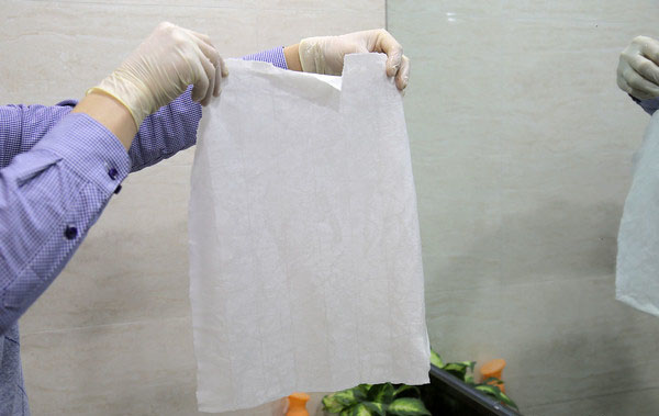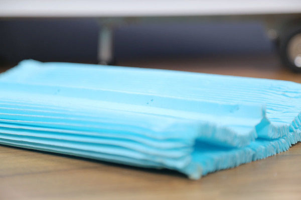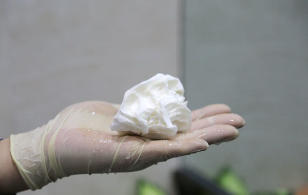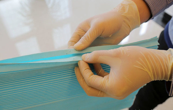 我們又剪下一塊主芯濾紙,將其放置在水槽內(nèi),遇水后濾紙已經(jīng)完全被浸透了,并且從水槽中將濾紙?zhí)崞饋,在折線處已經(jīng)出現(xiàn)了斷裂,毫無韌性可言。用手將浸濕的濾紙攥成一團,不僅有水從濾紙中析出,而且外形看上去就像被浸濕的普通紙巾一樣。所以空濾絕不能進入水分,否則會對濾紙造成損壞。