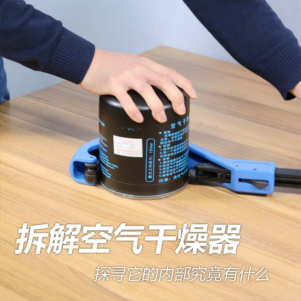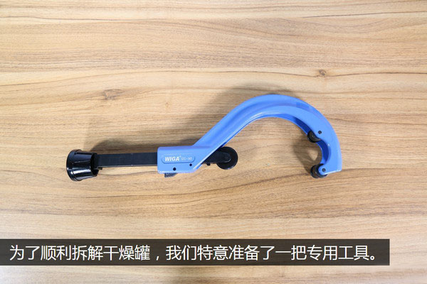 為了能順利的把干燥罐開膛破肚,我們特意準(zhǔn)備了一個專用工具,這樣就能夠比較方便的把外殼切開了。這里給大家透露一下,因為它能切割最大140毫米的管狀物體,所以售價可不菲。