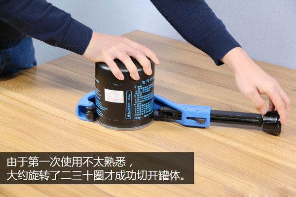 稱完重量就要開始切割了,首先把干燥罐放到切割工具上,調(diào)整好刀具的位置后開始旋轉(zhuǎn)切割,由于這個設(shè)備我也是第一次使用還不太熟練,大概旋轉(zhuǎn)了二三十圈才把罐體切開,但是好在切割過程還算是比較順利,切口也比較整齊,這一點我還是非常滿意的。