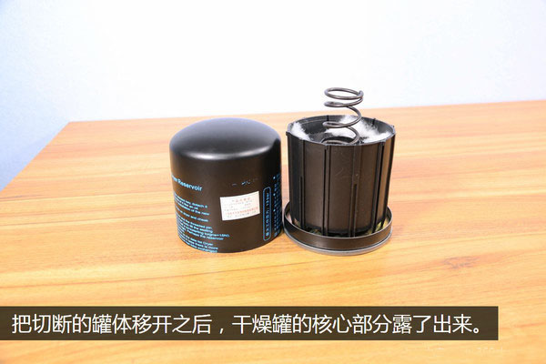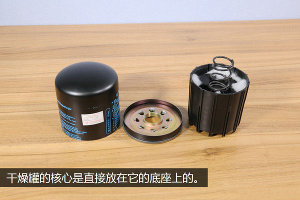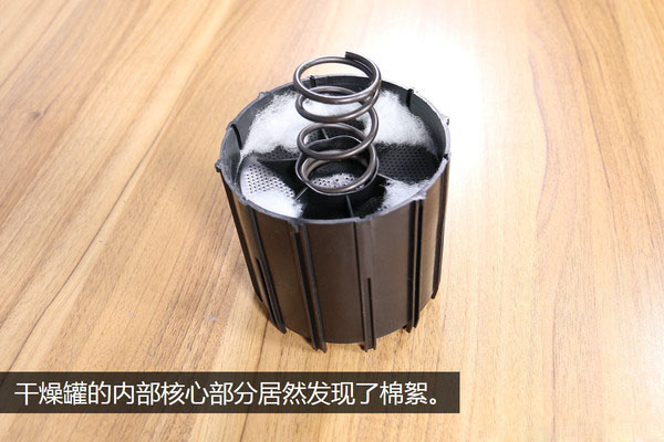 棉絮的究竟是干什么的咱先放一放,先把干燥罐的核心部分從底座上拆下來,拆的過程很簡單,輕輕一提它就下來了,因為核心是直接放在底座上的,并沒有任何的固定連接。經(jīng)過這樣一番拆解之后,這個干燥罐分為了三個部分,核心、底座、罐體。