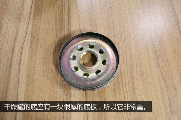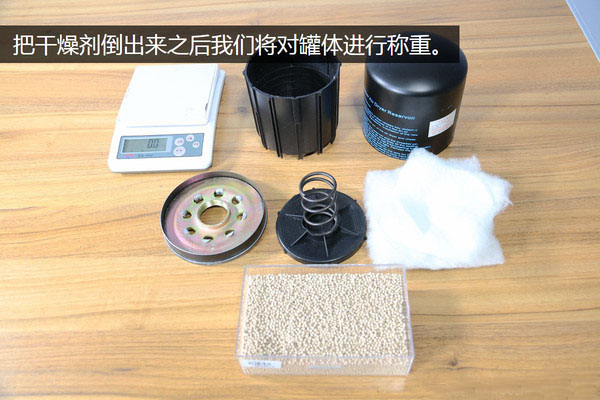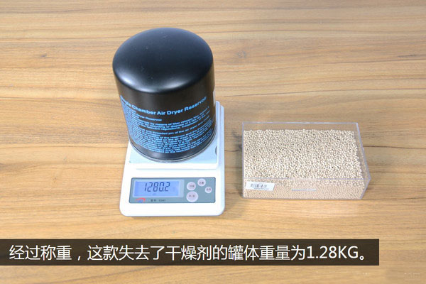 干燥劑的容量是衡量一款干燥罐質(zhì)量的重要指標(biāo),所以我把除干燥劑本身之外的其它零部件全部組合到一起,重新了進行一次稱重,發(fā)現(xiàn)失去了干燥劑的罐體有1.28KG重,較拆解之前少了0.63KG,而這一部分的重量就是干燥劑本身的重量。