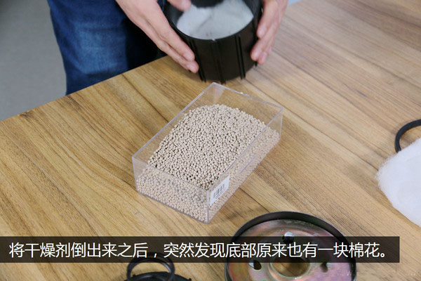 把干燥劑倒入一個器皿內(nèi),才發(fā)現(xiàn)這些干燥劑顆粒還是挺多的。全部倒出之后又在外殼的底部發(fā)現(xiàn)了另一塊棉絮,對此我表示汗顏,要知道一般的干燥劑顆粒工作的時候會產(chǎn)生一定量的粉末,如果靠這塊棉絮來進行阻擋,那結(jié)果可想而知。