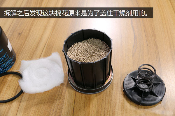 本來以為核心的壓蓋會很難拆下,但結(jié)果卻并不是這樣,因為用手拉住彈簧很輕松的就把蓋子拉了出來。打開蓋子之后那塊神秘的棉絮終于露出了真容,原來它是襯墊在壓蓋和干燥劑顆粒之間的,我猜測應(yīng)該是起到壓緊干燥劑顆粒的作用,但是這樣真的有用嗎?