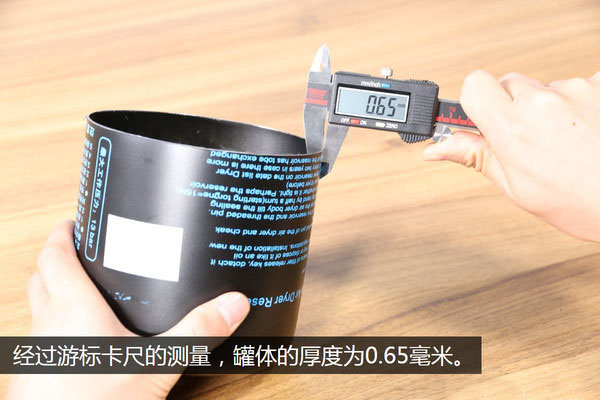 最后用游標(biāo)卡尺測量一下罐體的鐵皮厚度,經(jīng)過測量得到的數(shù)據(jù)是0.65毫米,我個人認為這已經(jīng)非常薄了,因為罐體的厚度直接決定了它的抗壓力性能,要知道干燥罐在工作的時候內(nèi)部是有非常大的氣壓的。
