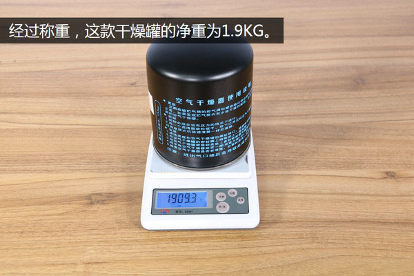 在開始拆解之前,我們要先對這款干燥罐進行稱重,這樣也方便和其它的幾款干燥罐進行直接的對比。我們使用的這個小稱還是比較精確的,最大能稱5公斤的物體,把干燥罐放上去之后讀數(shù)顯示為1909.3g,也就是1.9公斤多一點點。