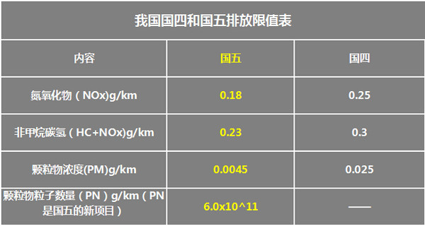 國五排放標準相比國四排放標準,氮氧化物(NOx)排放降低了28%,碳氫化合物和氮氧化物(HC+NOx)總和指標降低了23%,而對于柴油車的顆粒物濃度(PM)降低了82%,還有新增的顆粒物粒子數(shù)量(PN)檢測也是沖著柴油車來的,PN標準只對柴油車檢測。