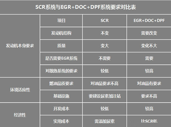 目前市場上,絕大部分發(fā)動機制造商都是在改進歐Ⅲ發(fā)動機的基礎(chǔ)上,再加上SCR或EGR+DOC+DPF等后處理系統(tǒng)來實現(xiàn)的。目前從開發(fā)成本來看,側(cè)重SCR系統(tǒng),但從長遠來看,將來油品質(zhì)量的提高和DPF技術(shù)的完善,后處理技術(shù)將會向EGR+DOC+DPF傾斜。