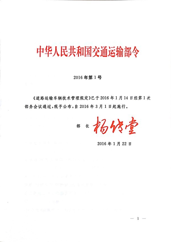 1月29日,中華人民共和國交通運輸部部長楊傳堂簽字,交通部令2016年第1號《道路運輸車輛技術(shù)管理規(guī)定》已于2016年1月14日經(jīng)第1次部務(wù)會議通過公布,并將在2016年3月1日起施行。這是《道路運輸車輛技術(shù)管理規(guī)定》交通部令2001年第4號后這15年來首次更新發(fā)布的行業(yè)政策。以下是交通部令2016年第1號《道路運輸車輛技術(shù)管理規(guī)定》原文: