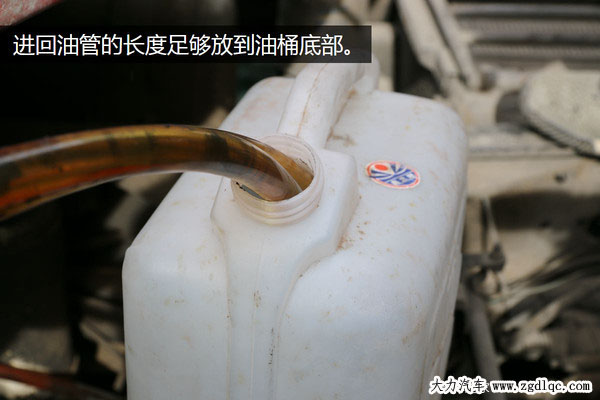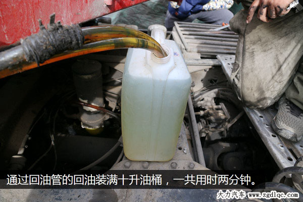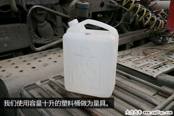 為了更直觀的進(jìn)行測(cè)試,我們選擇了一只容量為10升的塑料油桶作為容器,怠速運(yùn)行期間的燃料全部?jī)?chǔ)存在這里,可以把它理解為這輛卡車的一個(gè)油箱,只不過(guò)容量小一些而已。