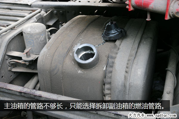 黃師傅的解放J6裝有一大一小兩個(gè)油箱,分為在車架的兩側(cè),一開(kāi)始我們選擇拆卸主油箱的出油和回油管,但是發(fā)現(xiàn)油管的長(zhǎng)度不夠長(zhǎng),所以只能選擇拆卸油管相對(duì)長(zhǎng)一點(diǎn)的副油箱油管來(lái)進(jìn)行測(cè)試。