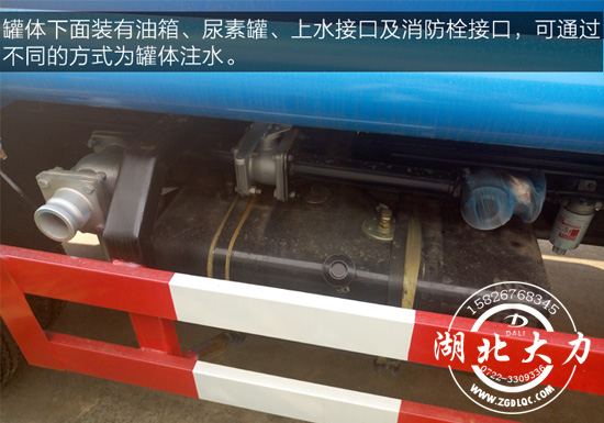 罐體下面裝有油箱、尿素罐、上水接口及消防栓接口,可通過(guò)不同的方式為罐體注水。