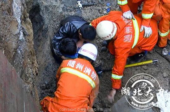 一名工人在旁邊不停地呼叫被埋壓者,消防戰(zhàn)士不停地用雙手往外挖刨泥土。時(shí)間在一分一秒地過(guò)去,被埋壓者的身體漸漸露了出來(lái)。
