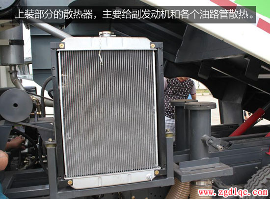 上裝部分的散熱器,主要給副發(fā)動機和各個油路管散熱。夏季溫度高,吸塵車工作時都會用到散熱器。選用國內品牌散熱器,使用壽命長、工作效率高。