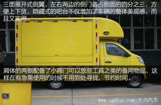 車身兩側還帶有隱藏式的吧臺,在售賣貨物的時候只需要將其向下拉即可使用,不僅方便而且還實用。在后輪的兩側增加了兩個工具箱,方便我們放些小東西,例如工具之類,這樣在遇到有需求的時候可以避免到處尋找。