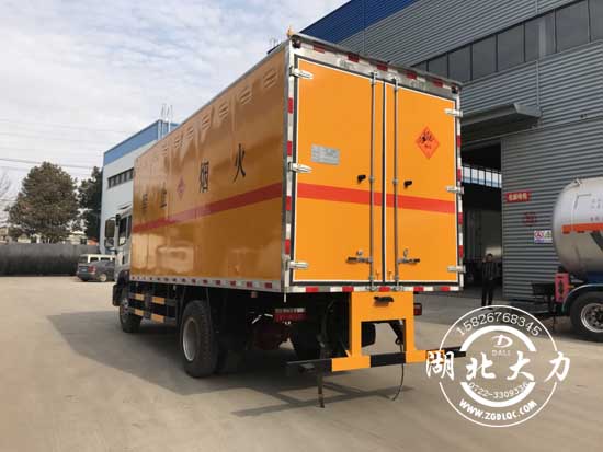 廂體頂部封閉,不可開啟。該車為危險品運輸車。隨底盤選裝駕駛室.前面罩,前組合燈具.運輸品名:黑火藥,壓縮黑火藥,炸藥,雷管,類項號:1.1B,1.1D,1.1G,1.2G,1.3G.廂體側(cè)面板選裝開百葉窗,選裝不帶側(cè)門,側(cè)門型式及位置;廂體顏色可變化,文字噴涂位置可變化.側(cè)面及后下部防護裝置材料為Q235,與車架采用焊接連接.后下部防護裝置斷面尺寸(mm):120×50,離地高度:520mm。選裝液壓升降尾板,選裝液壓尾板時收起狀態(tài)的水平長度為300mm,僅采用排氣管前置、子午胎,限速裝置,輔助制動裝置和前盤制動器的底盤;限速80km/h.安裝具有衛(wèi)星定位功能的行駛記錄儀; ABS系統(tǒng)生產(chǎn)廠家,型號 :焦作博瑞克控制技術(shù)有限公司,J ABS.安裝具有衛(wèi)星定位功能的行駛記錄儀.僅采用10.00R20 18PR,295/80R22.5 16/18PR輪胎。