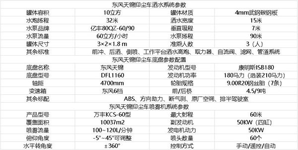 東風(fēng)天錦抑塵車罐體容積10方,罐體材質(zhì)為4mm厚武鋼優(yōu)質(zhì)板材,億豐品牌灑水泵(帶自吸自排功能),配套萬豐品牌噴霧機(jī)組,配置如下: