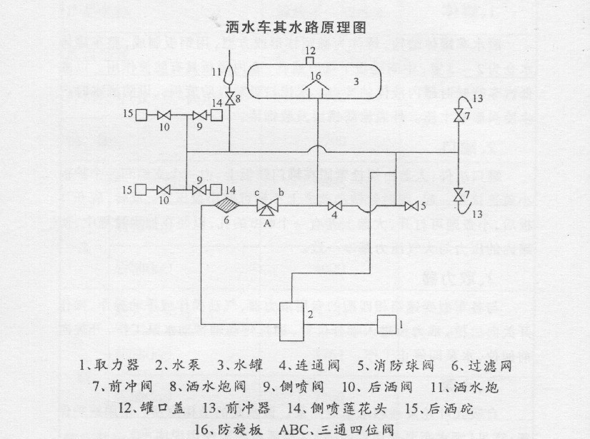 (4)作消防用:灑水車也通過(guò)本車水泵和消防接口作為應(yīng)急消防用,其操作程序是在消防接口接消防設(shè)備,打開(kāi)消防接口球閥,關(guān)閉球閥1和2,關(guān)閉其他灑水噴頭,將四位三通閥的標(biāo)記擰到B位置,使 A-C相通,拉動(dòng)取力器開(kāi)關(guān),使水泵開(kāi)始工作,此時(shí)即可通過(guò)消防接口向外提供消防用水。停止工作時(shí)各開(kāi)關(guān)回位。