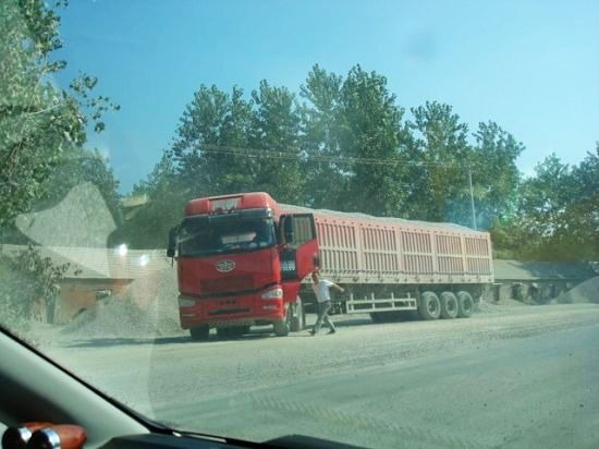 路上隨處可見等候卸貨的嚴重超限超載半掛大貨車
