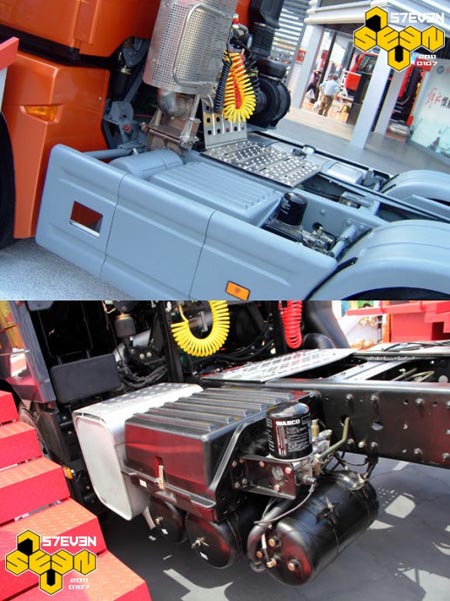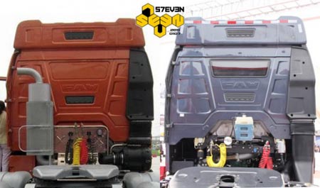 從后面看,J6HC的空濾雖然沒有布置在底盤里或者駕駛室下方,但總體結(jié)構(gòu)比較緊湊。但是J6H不但駕駛室打了補(bǔ)丁,進(jìn)氣管也打了補(bǔ)丁,硬生生的加長(zhǎng)了一截,看起來很怪異。另外膨脹水箱也沒有收納起來,而是外露在駕駛室后圍上,讓人感覺十分遺憾。