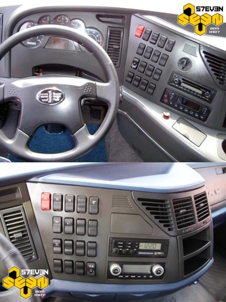 J6HC當(dāng)年的儀表臺(tái)是樣件,甚至沒有開皮紋。J6H采用與J6P一樣的儀表臺(tái),雖然套色的結(jié)構(gòu)拜托了中國(guó)重卡惡俗的仿桃木習(xí)慣,但藍(lán)灰的顏色搭配可能并不是最好的選擇吧。