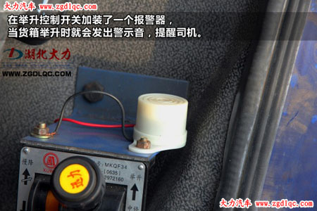 在這輛自卸車上,我們也看到了這樣的報(bào)警器,就安裝在貨箱舉升控制器上面,當(dāng)貨箱舉升時(shí)就會(huì)不停的發(fā)出報(bào)警音,當(dāng)貨箱放下后停止報(bào)警。