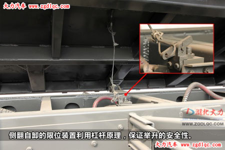最后我們來看看側(cè)翻自卸的限位裝置,巧妙的利用了杠桿原理,當(dāng)貨箱翻轉(zhuǎn)到指定位置后,帶動(dòng)鋼絲繩帶動(dòng)圖中杠桿原理,啟動(dòng)限位裝置,保證了舉升的安全性。