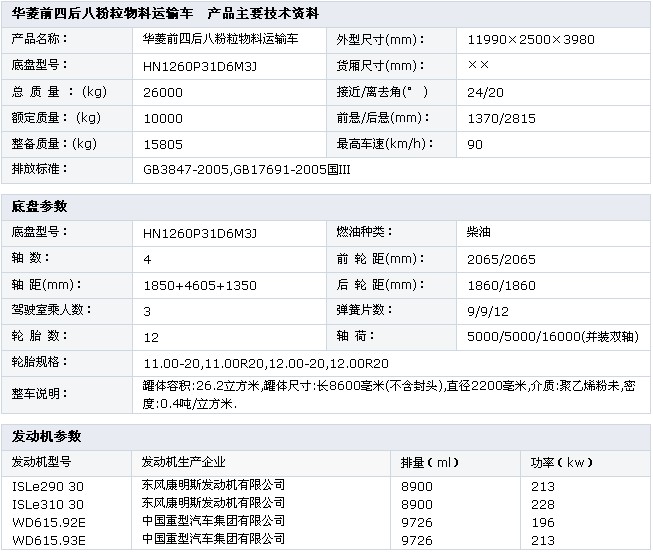 華菱前四后八粉粒物料運(yùn)輸車  底盤型號(hào):HN1260P31D6M3J 額定質(zhì)量:10000